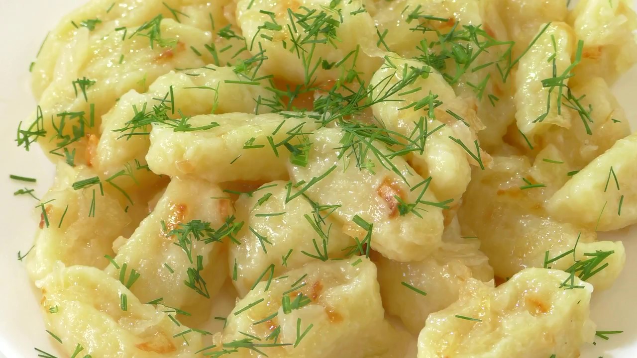 6. Затем выкладываем галушки в чашку и выливаем сверху зажарку. Подаем со сметанкой или соусом.